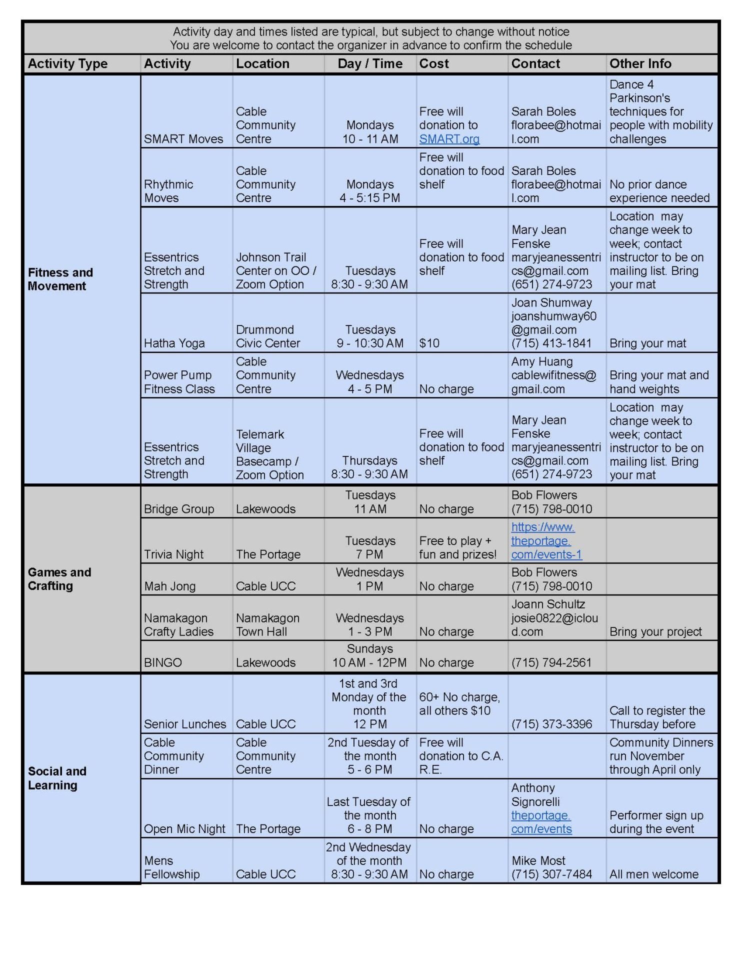 Keep in mind that activities are subject to change. Please remember to call or email the event organizer(s) for confirmation of class/event times and locations if you are unsure.
