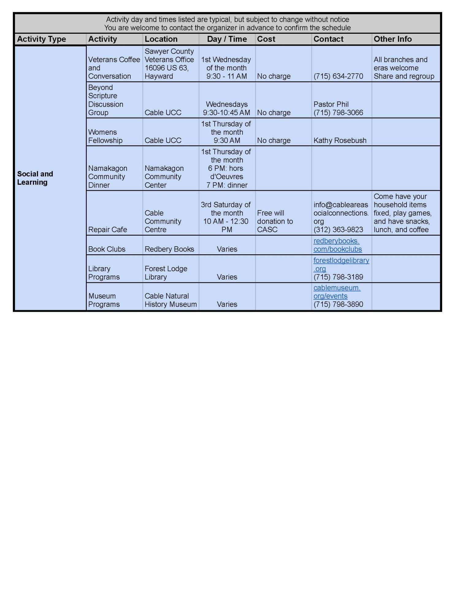 Check out the Cable Area Chamber of Commerce's comprehensive list of local activities.