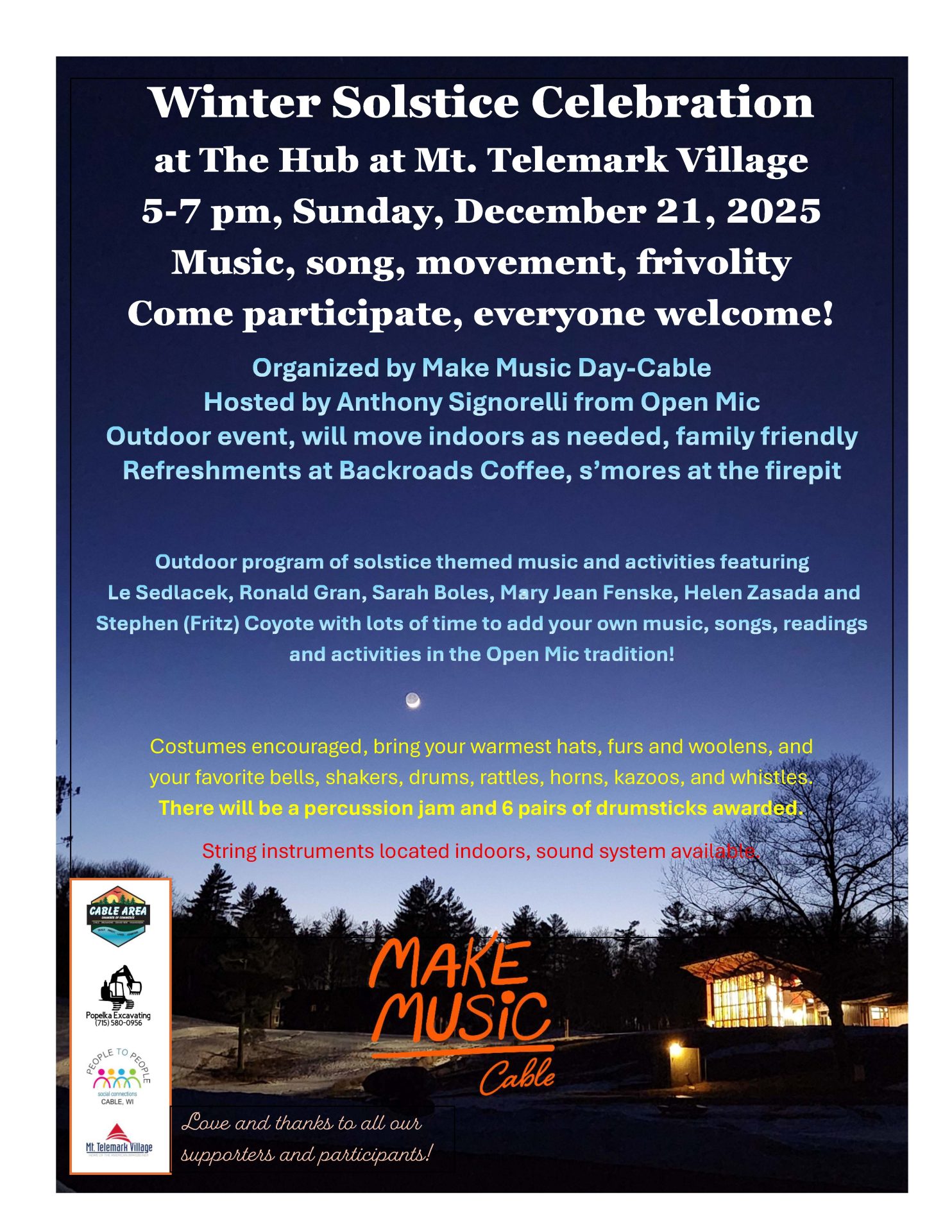 Cable, Wissonsin (population 853) joined MMD in 2024. We are adding a Winter Solstice event for 2025, making us one of only two communities in Wisconsin to host an event for winter.